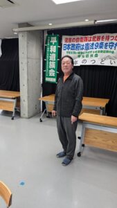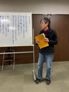 三多摩青年合唱団の箱崎さんは、雪の中、都内での平和遺族会の新年会に出席して、オリジナル曲2曲を歌い、うたごえ新聞の購読を訴えたところ、去年は断られた会長さんが購読してくれることになりました。
